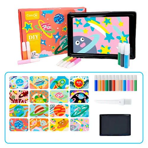 - Contém: 16 Desenhos; 12 Tubos de Areia Criativa; Pincel; Bandeja