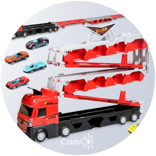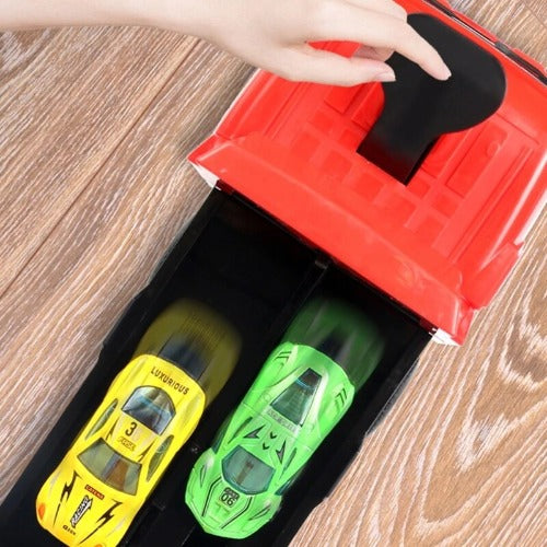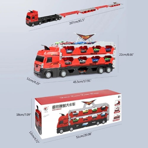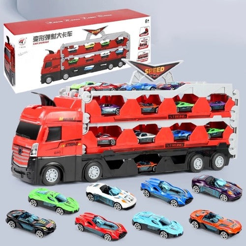 Grande portador de caminhão que pode transportar até 8 mini carros de corrida de liga. Este caminhão não apenas permite que as crianças transportem seus carros favoritos com facilidade, mas também serve como uma parte da diversão.