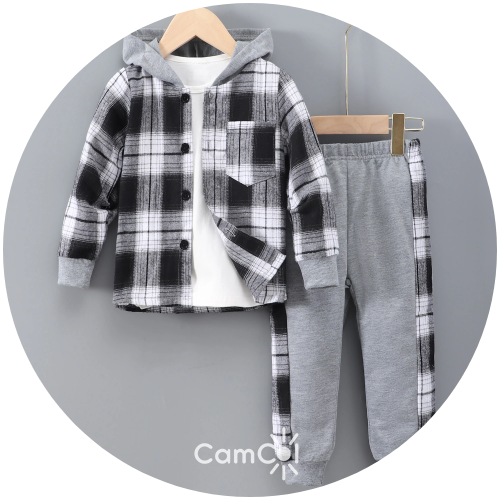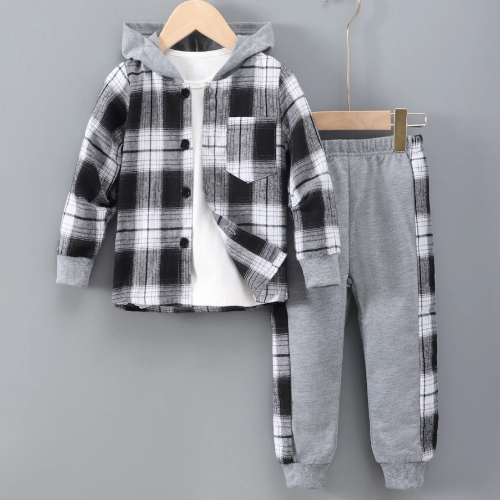 Escolha encantadora para os pequenos fashionistas, perfeito para os dias de verão e outono. Este conjunto oferece uma estética que evoca um toque de moda antiga, com um toque contemporâneo. O destaque deste conjunto é o contraste entre o capuz e o terno xadrez!