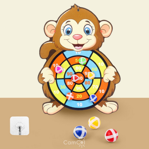 O objetivo do jogo é simples: as crianças devem lançar bolinhas adesivas em um alvo, ajustando sua força para alcançar os pontos certos. O uso de bolas adesivas torna o jogo seguro para atividades internas e externas, sem risco de objetos duros ou pesados.