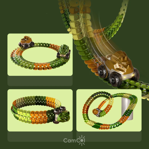 A pista que dobra, gira e desafia a imaginação! No Dinossauro Race, o carrinho motorizado percorre loops e subidas com muita ação e criatividade sem limites!