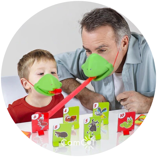 As máscaras de sapo e lagarto, cada uma com uma língua longa e flexível, são a chave para este jogo cativante. Os jogadores colocam as máscaras e tentam lamber as peças de tabuleiro correspondentes às suas máscaras.