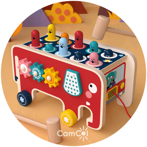 Este brinquedo cativante apresenta um elefante amigável e suas amigáveis toupeiras que aparecem e desaparecem em aberturas. As crianças usam um martelo para bater nas toupeiras à medida que elas aparecem.