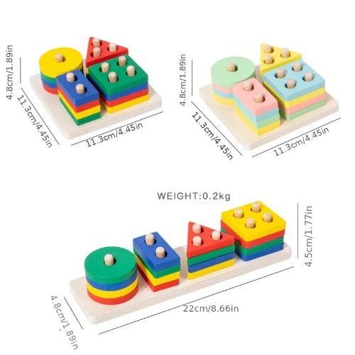 Cada bloco de madeira apresenta uma forma geométrica diferente, como triângulo, quadrado e círculo. O que torna especial é a régua empilhada, que serve como um guia para ajudar as crianças a alinhar e montar os blocos corretamente.