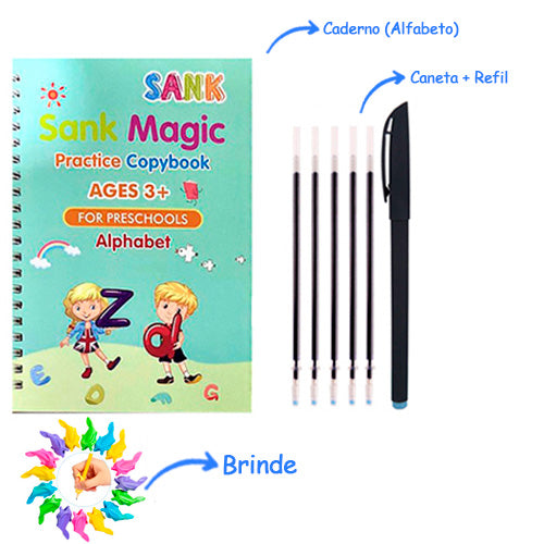O Kit de Cadernos de Caligrafia Infantil com canetinhas que apagam após 15 minutos, permite que seu filho pratique e aprimore sua escrita sem gastar papel!
